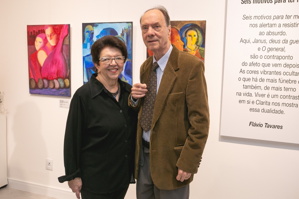 O escritor e jornalista FLÁVIO TAVARES, amigo da artista desde os tempos de política universitária, comparece com um texto em que comenta sua obra recente em pintura, (na Sala Branca) salientando a série “Seis motivos para ter medo”.
