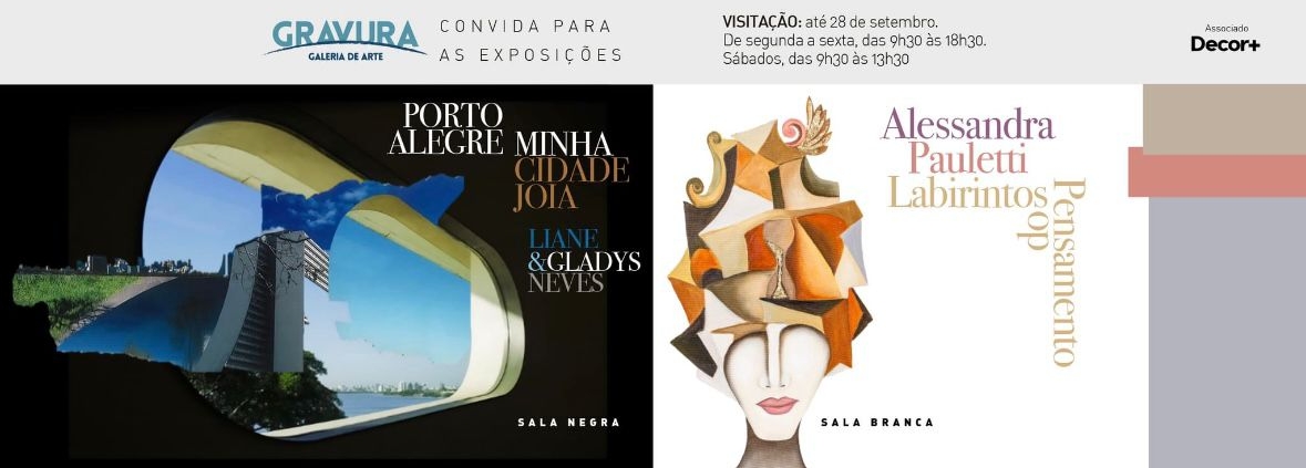 A Gravura Galeria de Arte promoverá a vernissage de duas novas exposições no dia 29 de agosto, das 18h30 às 20h30. “Porto Alegre Minha Cidade Joia” será apresentada na Sala Negra pela fotógrafa Liane Neves e pela arquiteta Gladys Neves, que criaram esta exposição unindo seus talentos, tendo como tema a cidade de Porto Alegre. Na Sala Branca, a artista plástica Alessandra Pauletti irá expor pinturas e desenhos em “Labirintos do Pensamento”.