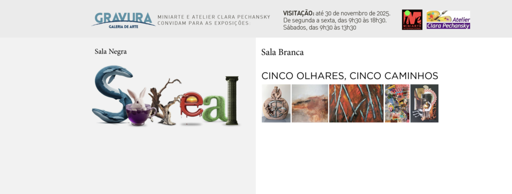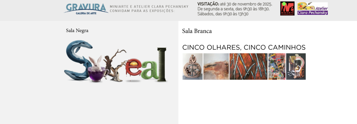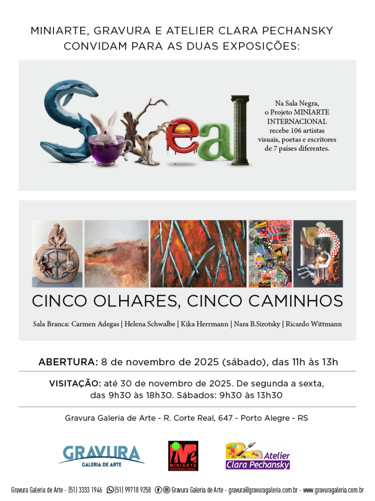 As exposições “Miniarte Surreal – Edição 52” e “Cinco Olhares, Cinco Caminhos” têm abertura oficial no dia 8 de novembro de 2025, das 11h às 13h, e permanecem abertas à visitação até 30 de novembro, na Gravura Galeria de Arte.
