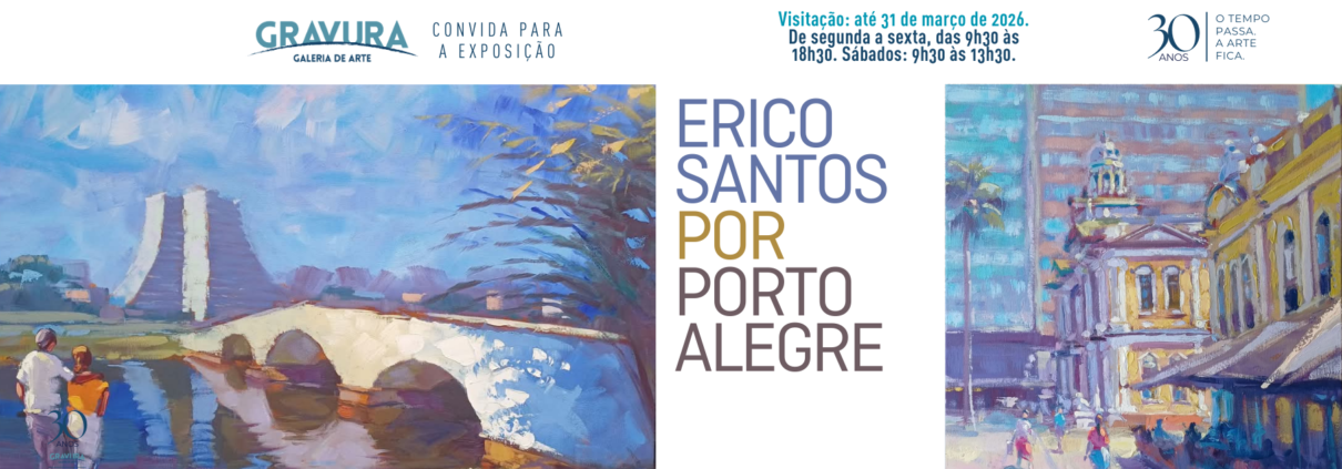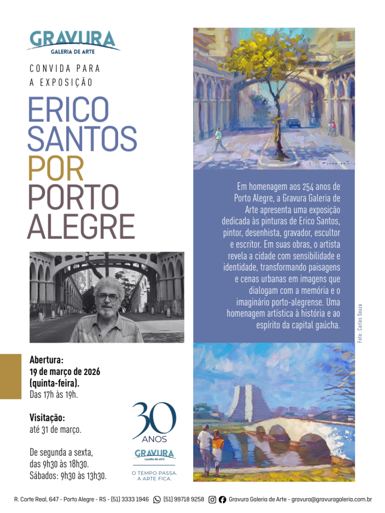 A Gravura Galeria de Arte homenageia os 254 anos de Porto Alegre com uma exposição do artista visual Erico Santos que retrata locais históricos da capital. A abertura da mostra “Erico Santos por Porto Alegre” acontece nesta quinta-feira (19/03), das 17h às 19h, e a visitação se estende até 31 de março.