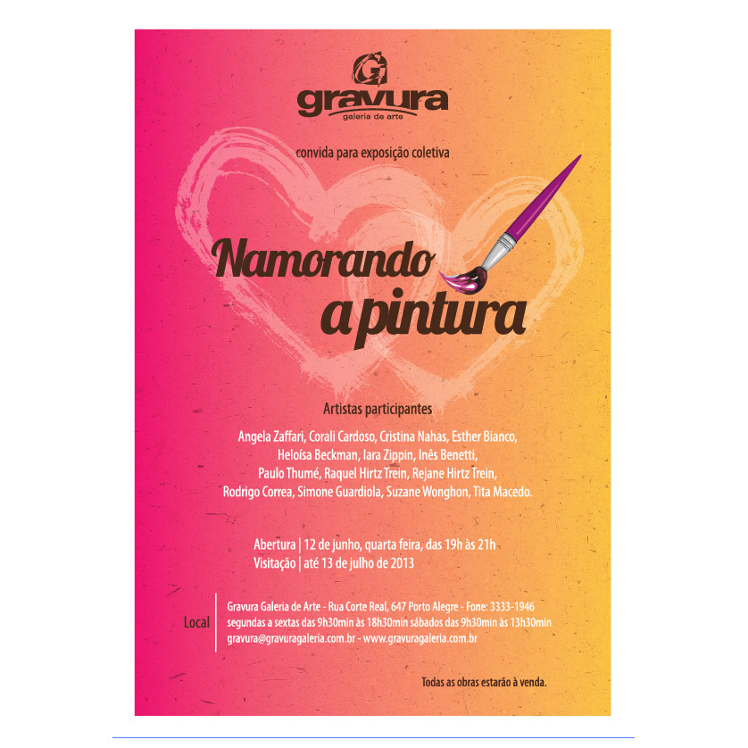 Na abertura do dia 12 de junho, além de coquetel para convidados, haverá uma performance musical com voz e violão de Miguel Rodrigues. Exposição “Namorando a Pintura” Local: Gravura Galeria de Arte – Rua Corte Real, 647, Porto Alegre Abertura: 12 de junho de 2013, quinta-feira, das 19h às 21h Visitação: até 13 de julho de 2013 Horário: de segunda a sexta, das 9h30 às 18h30; sábados, das 9h30 às 13h30 www.gravuragaleria.com.br